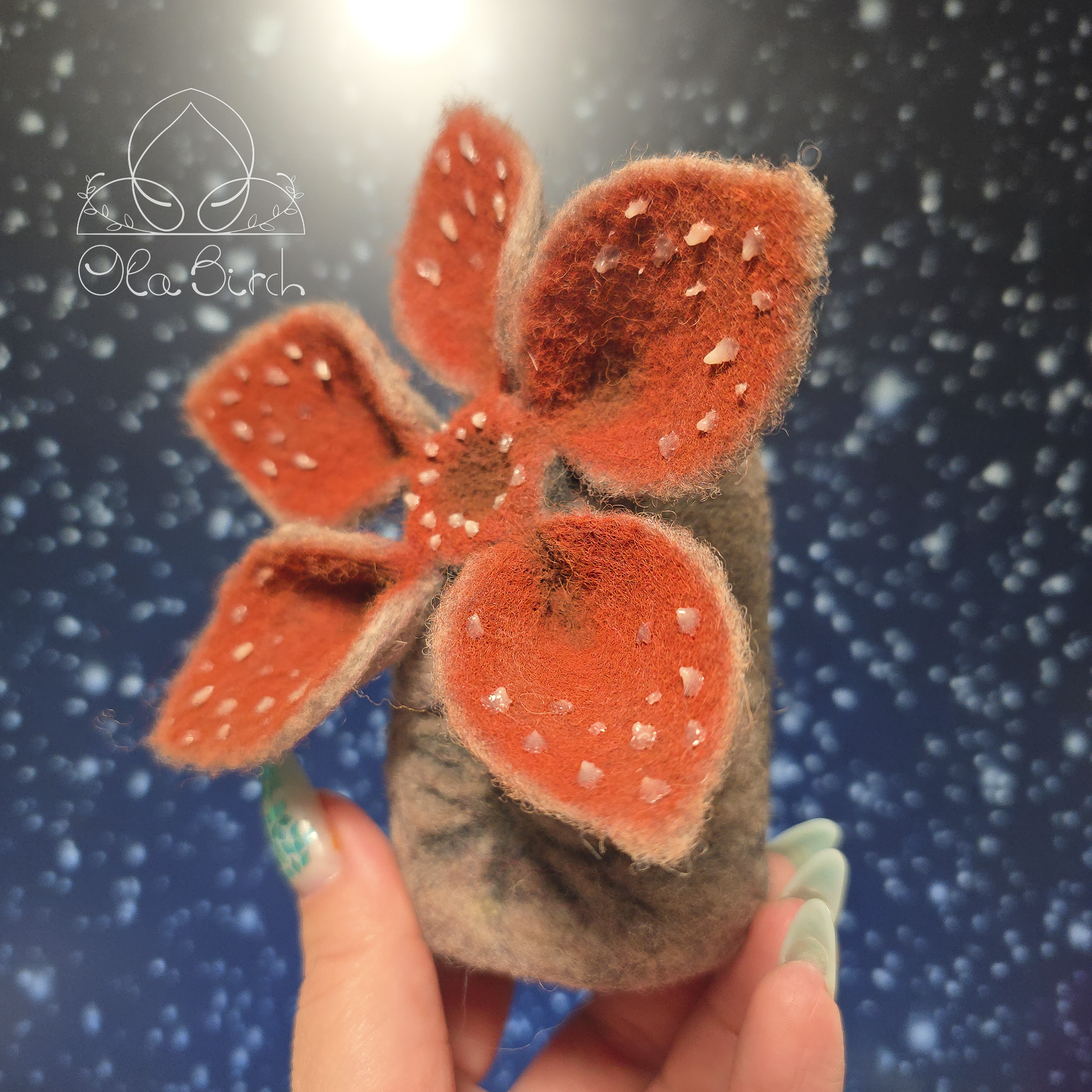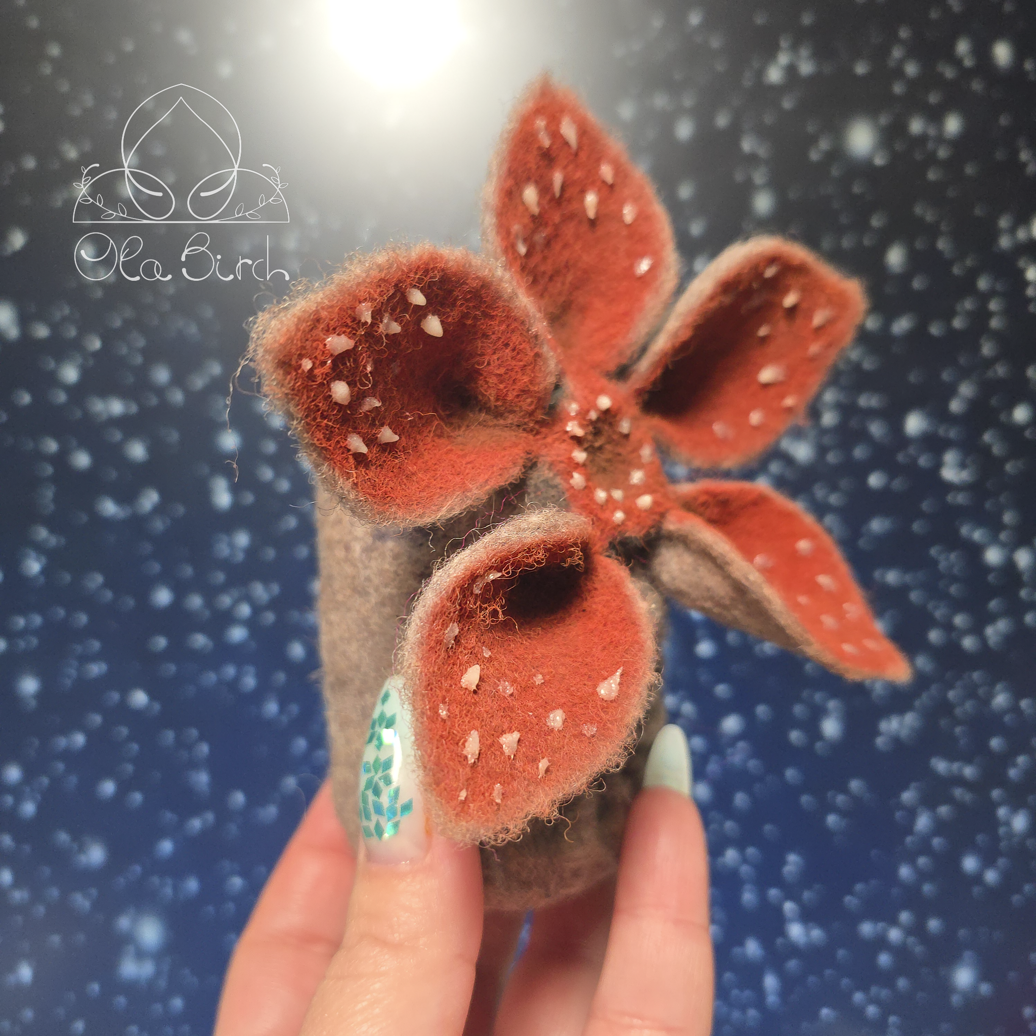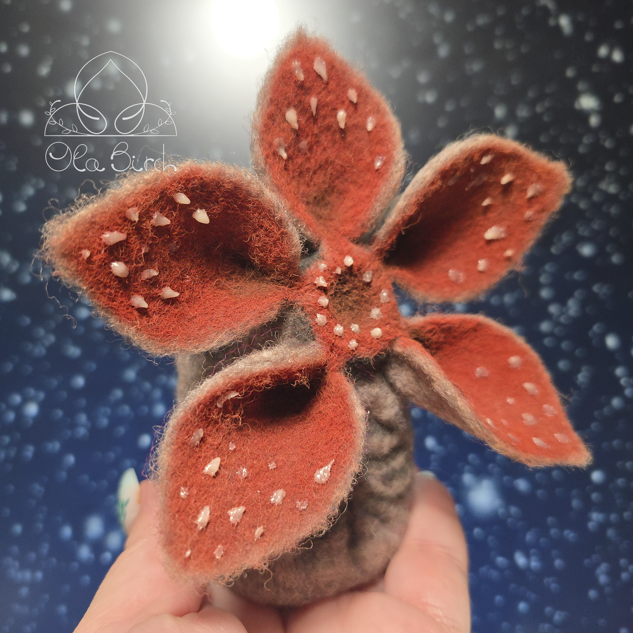 This one-of-a-kind needle-felted Demogorgon is carefully sculpted by hand from wool, with layered petal details and glow-in-the-dark teeth that softly illuminate in low light. Thoughtfully crafted and intentionally imperfect, it blends sculptural artistry with a touch of the uncanny.